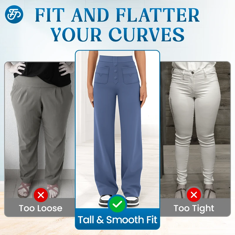 Experience a sleek silhouette with FlexiPants's high-waist design that effortlessly smooths your tummy for both comfort and style.